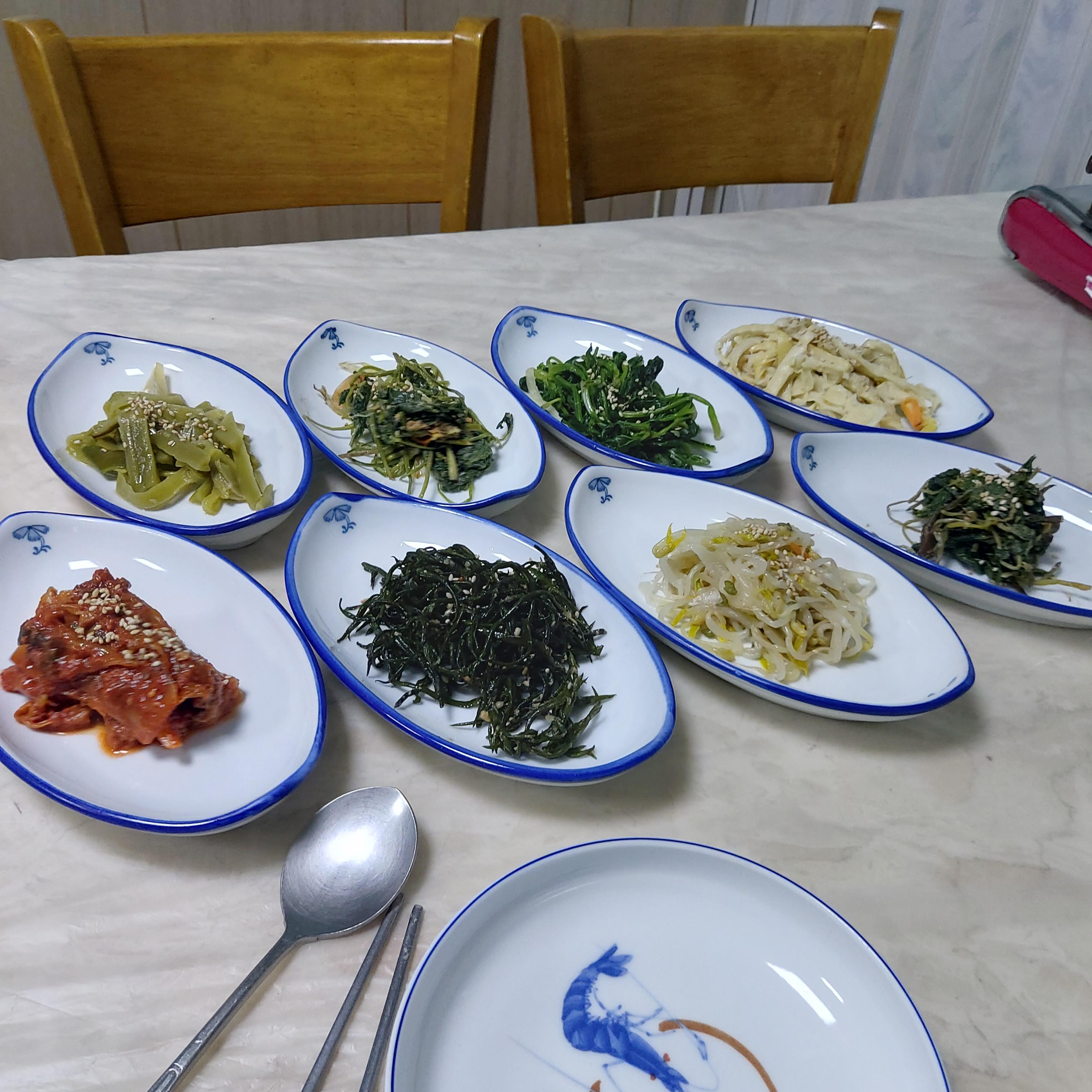 나물반찬의 모습이 산골지방의 밴반기행의 어떤 것을 떠올리게 한다.